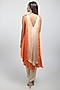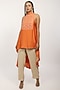 Featuring an orange draped tunic in satin base with organza embroidered patch. It is paired with contrasting ivory cigarette pants.