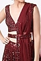 This occasion-ready burgundy lehenga in net is embellished with sequins embroidery. Complementing the look is a matching blouse, a belt and a dupatta. Style the look with dangler earrings and heels for the perfect bridesmaid outfit.