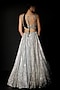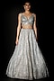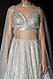 Featuring a gracious ice blue lehenga in organza base, an ideal choice for the Indian bride. This chic lehenga set has the ageless craftsmanship of silver cutdana, sequins, and crystals embroidery. It includes a matching blouse and a dupatta to complete the bridal look. Style the look with dangler earrings and heels for the perfect sangeet, wedding, or engagement ceremony.
