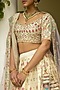 This occasion-ready ivory lehenga in raw silk is embellished with silk thread, dabka, sequins, cutdana and zardosi hand embroidery. Complementing the look is a matching blouse and two net dupattas. Style the look with dangler earrings and heels for the perfect bridesmaid outfit.