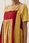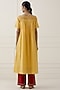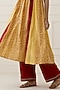 Featuring a yellow kurta in cotton base with block print. It is paired with contrasting red pants.