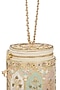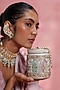 Featuring an ivory potli in leather base with jharokha motifs, thread and zari embroidery. It has a leather lining, zip closure and gold chain handle. This elegant piece is perfect for festive occasions and evening events, adding a touch of sophistication to any outfit.