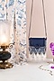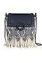 Featuring a midnight blue denim beaded sling bag in leather base with silver chain and white beaded tassels. It has cotton underlining.