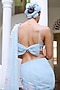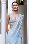 Featuring a blue concept saree in tulle and silk base with embroidery. It is paired with a tulle embroidered corset. Accessorize it with statement jewellery and heels for weddings or sangeet ceremonies.