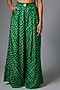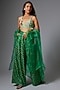 Featuring a green bralette in handwoven silk base with glass beads, sozni, shells, and mirror hand embroidery. It is paired with high-waisted pleated hand dyed silk bandhani trousers and an organza embroidered dupatta. Accentuate with statement jewellery and heels for a wedding, sangeet or engagement ceremony.