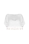 Featuring an ivory tube bralet in crepe with tassel hanging comes along with ivory flared skirt in satin linen with floral motifs. It is paired with an ivory tulle small cape with pearls, bugle beads, and thread zardosi embroidery.
