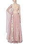 This set features a lilac crop top in satin and tulle base with roses and pearl embroidery all over the front and back. It is paired with lilac tulle skirt with an ivory floral threadwork panlels all over the ghera. It comes along with lilac tulle dupatta with floral lace border at the edges.