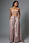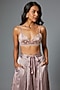 Featuring a lilac bralette in silk base. It is paired with matching pleated high-waisted trousers.