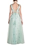Featuring a mint blue bohemian lehenga set in silk satin and silk linen base with ruffles and screen printed cherry motifs. It has rose buds, tribal motif and zardosi embroidery along with handwoven silk organza dupatta.