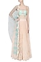 This set features a mint crop top in tulle and satin linen base embroidered with rose motifs all over. It is paired with pink vintage lace skirt with pearl embroidery all over. It comes along mint green vintage printed net dupatta with rose cutwork lace border at the edges.
