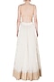 Featuring an off white illusion sleeveless crop top in raw silk base with embroidered zardozi of bugle bead and silk floss botanicals with a lace underlay. It is teamed with a high waist handwoven chanderi lehenga skirt with pockets and an embroidered tulle dupatta with a floral border.
