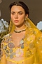 Featuring a yellow lehenga in organza, silk and crepe base with beads, floral motif and applique embroidery, including a can-can. It is paired with an embroidered blouse and an organza dupatta. Style it with a necklace, dangler earrings and heels for a bridal look.