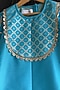 Featuring a blue kurta for girls in silk and chanderi base. It is paired with sharara pants and a dupatta. Style it with sandals and hair accessories for a festive occasion.