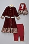 Featuring a maroon anarkali for girls in velvet base with placement deer embroidery, gold lace and chanderi paneled detailing. It is paired with pants having an elasticated back and a net-ruffled dupatta. Style it with sandals and hair accessories for a pooja ceremony or festive occasion.