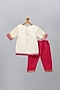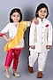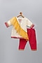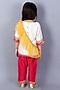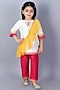 Featuring an off-white kurta in raw silk base with zari embroidery and lace detailings. It is paired with contrasting pyjama pants in cotton silk base and a ruffled dupatta.