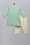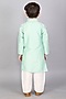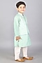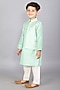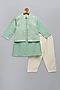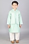 Featuring a pastel green kurta for boys in cotton silk base with an attached jacket. It is paired with off-white pyjama pants. Style it with mojaris and a watch for a wedding ceremony or festive occasion.