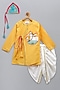 Featuring a yellow angrakha kurta for boys in cotton silk base with pichwai embroidery. It is paired with off-white dhoti pants and a mukut. Style it with mojaris and a watch for a wedding ceremony or festive occasion.