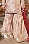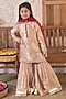 Featuring a golden floral kurta for girls in silk base. It is paired with striped tissue sharara pants and a net dupatta. Style it with sandals and hair accessories for a festive occasion or wedding ceremony.