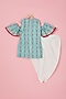 Featuring a powder blue off-shoulder top for girls in cotton base. It is paired with white dhoti pants. Style this outfit with sandals and a cute hair accessory for any festive occasion.