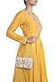 Featuring a beige and gold box clutch in raw silk base with embroidery. It has a metallic frame and detachable sling chain.