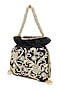 Featuring a black potli in raw silk base with hand embroidery and detachable sling chain. It has a satin underlining.