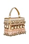 Featuring a gold box clutch in raw silk base with a long sling chain and hand embroidery. Style it with traditional outfits for a vibrant touch, perfect for parties and festive occasions.
