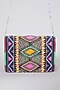 Featuring a multi colored clutch in raw silk base with hand embroidery and sling chain. It has satin underlining.