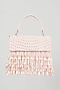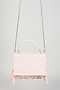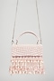 Featuring a pink box clutch in raw silk base with hand beaded detailing. It has a raw silk lining and a sling chain.