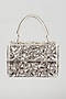 Featuring a silver box clutch in raw silk base with stonework. It has a raw silk lining and a sling chain.