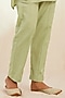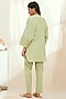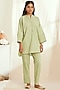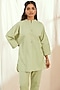 Featuring a green long top in linen base with front opening. It is paired with matching narrow pants.