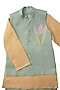 Featuring a mint green nehru jacket for boys in pure cotton satin base It is paired with a yellow kurta and mint green straight pants. Team it up with mojaris and watch for a festive occasion, mehendi or haldi ceremony.