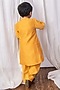 Featuring a mustard yellow kurta for boys in chanderi base with thread hand embroidery. It is paired with white pants. Team it up with mojaris and watch for a festive occasion or haldi ceremony.