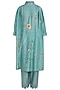 Featuring a mint high neck kurta in chanderi silk base with gathered shoulders, keyhole neck, pintuck and glass bead embroidery. It is paired with matching trousers.