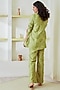 Featuring an olive green oversized blazer in chanderi silk base with abstract floral motifs. It is paired with matching bootcut pants.