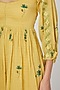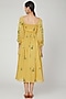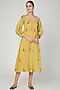 Featuring a tumeric yellow dress in muslin silk base with embroidered sleeves and print.