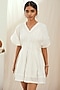 Featuring a white mini flared dress in linen base with box pleats detailing. It is paired with a matching inner.
