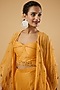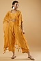 Featuring a mustard yellow jacket in chanderi silk base with bullion knot embroidery. It is paired with a matching hand embroidered top and pants.