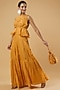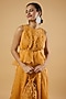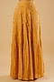 Featuring a mustard yellow top in chanderi and cotton base with sequin and bead embellishment and tassels. It is paired with a matching skirt and a belt.