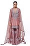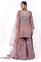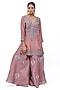 Featuring a rose pink kurta in silk base with badla, zari and crystal embroidery. It is paired with textured sharara pants and a dupatta. Accentuate it with dangler earrings and heels for a festive occasion or sangeet ceremony.
