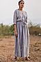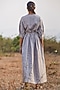 Featuring a light grey maxi dress in linen base with dark grey printed stripes, tailored pleated lantern sleeves, an overlapped yoke, gathered waist, exaggerated drop shoulders, side slits, and inseam pockets.