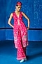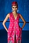 Featuring a pink jacket in satin dupion base with floral print, a deep V-neckline and hand embroidery. It is paired with wide-legged pants. Accentuate it with diamond jewellery and block heels for sangeet ceremonies.