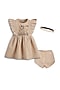 Featuring a beige dress for girls in cotton base with floral embroidery. It is paired with a bloomer and headband. Style it with cute hair accessories and sandals for a wedding or festive occasion.