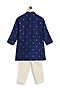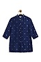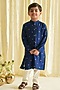 Featuring a blue kurta for boys in viscose brocade base with embroidery. It is paired with cotton pyjama pants. Style it with mojaris and a watch for a wedding ceremony or festive occasion.