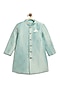 Featuring a blue sherwani for boys in viscose brocade base with band collar and ornate metal buttons. It is paired with a cotton slub kurta, a pocket square and cotton pants. Style it with a watch and pair of mojris for a wedding, sangeet or engagement ceremony.
