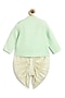 Featuring a green bandhgala for boys in cotton satin base with an attached pocket square and embroidery. It is paired with soft cream viscose foil print dhoti pants. Style it with a watch and pair of mojris for a wedding, sangeet or engagement ceremony.