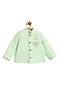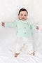 Featuring a green bandhgala for boys in cotton satin base with an attached pocket square and embroidery. It is paired with white cotton pants. Style it with a watch and pair of mojris for a wedding, sangeet or engagement ceremony.