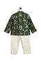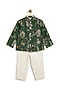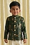 Featuring a green floral bandhgala for boys in brocade viscose base. Style it with a watch and pair of mojris for a wedding, sangeet or engagement ceremony.