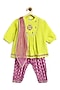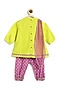 Featuring a green kurta for girls viscose base with embroidery. It is paired with purple salwar pants having foil print and a chiffon dupatta. Style it with cute hair accessories and sandals for a festive occasion or wedding ceremony.