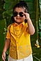 Featuring a yellow shirt for boys in soft cotton base with quirky fish print. It is paired with contrasting pre-stitched cotton mundu dhoti pants having attached shorts and a printed angavastram.