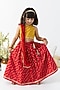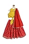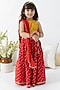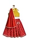 Featuring a red lehenga for girls in cotton base with bandhani print. It is paired with an embroidered yellow blouse and a viscose dupatta. Style it with hair accessories and sandals for a festive occasion or wedding ceremony.